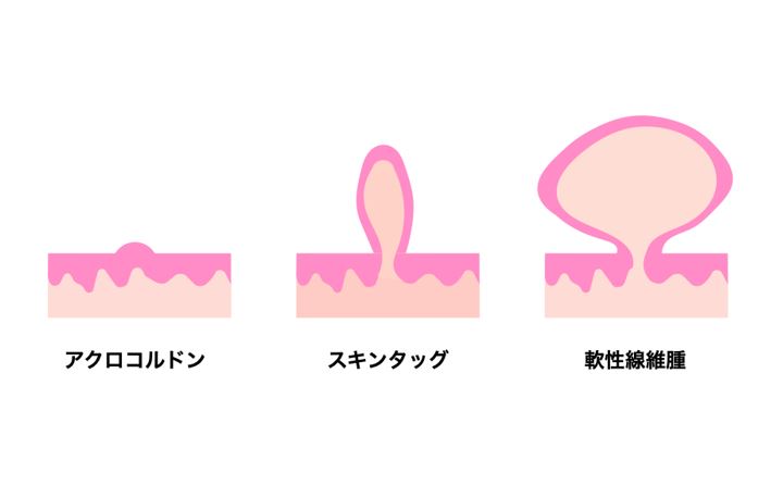 大きさにより呼び方が異なり、①小型であまりもりあがっていないものはアクロコルドン、②根元が細く飛び出ているものをスキンタッグ、③大型のものを軟性線維腫といいます。そのほか脂漏性角化症やウイルス性のイボ、ホクロが混ざっている場合もあります。