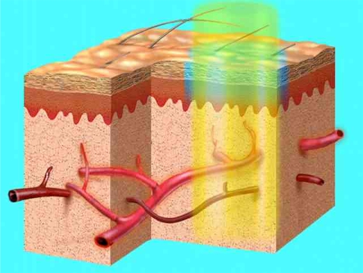 照射されるレーザー光線(波長595ナノメートル)は、血液中のヘモグロビンに吸収されやすいという特長があります。レーザー光により、血管の集まった病変部の血管が閉塞し、赤み・毛細血管拡張症、酒さ、赤ら顔、赤ニキビ、ニキビ跡の赤み、赤色瘢痕、ケロイドの赤みなどの症状を改善します(当院ではイチゴ状血管腫・乳児血管腫への照射は行っていません)。